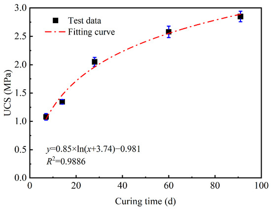 where Rc is the unconfined compressive strength (MPa); A is the cross-sectional area of the sample (mm2); P is the maximum pressure when the sample is damaged (N); and D is the diameter of the sample (mm), taking the value of 39.1 mm. Each group consisted of three sample replicates, and the final unconfined compressive strength was determined from the average strength of these three samples.