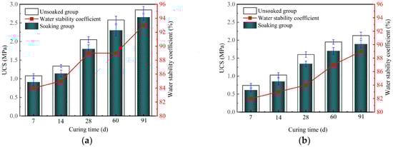The water stability test was conducted following the CJ/T 486-2015 [44]. The solidified clay samples were soaked in a water bath environment at 20 °C for one day, ensuring that the water level remained 2 cm–3 cm above the top of the samples. Upon completion of the water bath, excess water on the surface of the samples was absorbed using a dry cloth, followed by the proceed of the UCS test. Based on the test results, the water stability coefficient of the solidified clay was calculated, defined as the ratio of the UCS of the soaked sample to that of the non-soaked sample (see Equation (7)).