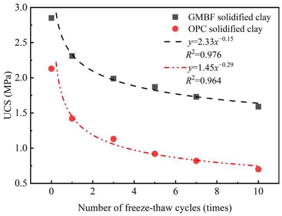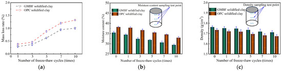 The freeze–thaw cycle test method was conducted according to the T0858-2009 standard, which was derived from JTG 3441-2024 [43]. Specifically, (I) clay mixed with GMBF to form GMBF solidified clay, clay mixed with OPC to form OPC solidified clay, and solidified clay were subjected to a freeze–thaw cycle test after 91 days of standard curing. (II) During the freeze–thaw cycle, the sample was placed in a device set to −18 °C for 18 h and then transferred to a room at 20 °C to thaw for 6 h, which constitutes one freeze–thaw cycle. (III) The freeze–thaw cycles were conducted for 1, 3, 5, 7, and 10 times. After the freeze–thaw cycles, the mass loss rate and volume were first measured, and the mass loss rate is calculated as shown in Equation (8). (IV) UCS tests were conducted on solidified clay to determine the UCS of the freeze–thaw sample, and then their moisture content was measured.