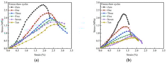where Wn is the mass loss rate of the specimen after n freeze–thaw cycles, m0 is the mass of the sample before freeze–thaw cycles (g), and mn is the mass of the sample in the n-th freeze–thaw cycle (g).