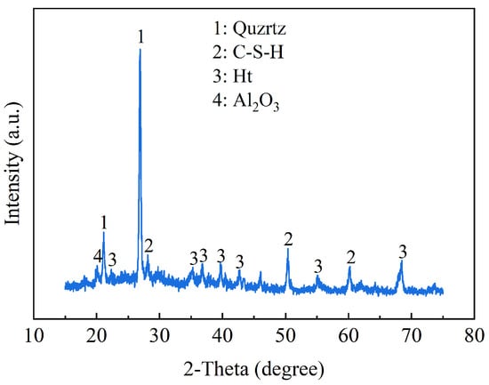 Before analyzing the microscopic morphology and mineral phases, representative fragments from UCS test samples were soaked in anhydrous ethanol for 24 h. After soaking, it was dried at a temperature of 50 °C for 48 h. To investigate the mineralogical composition, the freeze-dried fragments were ground and sieved through a 200-mesh sieve (0.074 mm) prior to scanning for 20 min, using a Rigaku SmartLab SE X-ray diffractometer (XRD) equipped with a Cu Kα source, covering a range from 15° to 75°, with a step size of 0.02°. The Rigaku SmartLab SE X-ray diffractometer used in this study is manufactured by Rigaku Corporation, which is located in Tokyo Metropolis, Japan. By analyzing the diffraction patterns, the diffraction peaks were identified and analyzed using the software Jade 6 to determine the presence of various mineral phases in the sample. The dried fragments were coated with a thin layer of gold and then analyzed using a Sigma 300 instrument to identify the hydrated phases and microscopic morphology. The Sigma 300 instrument used in this study is manufactured by Carl Zeiss AG, which is located in Oberkochen, Germany.