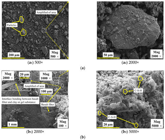 The microscopic morphological characteristics of SC and GMBF solidified clay are illustrated in Figure 19. The SC consists of particles of varying sizes, with a notable lack of effective interconnections among them upon mixing SC with GMBF to form GMBF solidified clay. After 91 days of curing, microscopic images of the GMBF solidified clay reveal the formation of effective bonds between the particles, which can be attributed to the presence of hydration products [65]. Compared to untreated clay, GMBF solidified clay demonstrates a denser structure with significantly reduced porosity. The particles encapsulate the BF because the hydration products are distributed on the surface of the fibers, resulting in close contact between the particles and the BF, which is facilitated by the bonding properties of these hydration products [27,66]. On the one hand, this interface bonding effect enhanced the interaction between the particles and the BF, confirming that the use of BF can improve the UCS of solidified clay. On the other hand, the binding effect of the hydration products leads to a typical agglomerated distribution of particles within the solidified clay, while the BF can connect these agglomerates, enhancing the linkage between the agglomerates. Specifically, when a force is applied to the specimen, the stress is transferred through the frictional interaction between the deformation of the BF and the particles or gel substances [25,48].