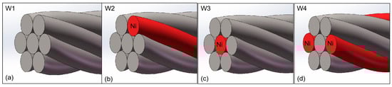 In order to study the best combination of toughness seven-wire, the ordinary welding wire is the main welding wire, and several Ni solid welding wires. The schematic diagram of the seven filaments is shown in Figure 2. In Figure 2a, seven ordinary solid welding wires are twisted as W1. In Figure 2b, six ordinary solid welding wires and a rich Ni solid welding wire are recorded as W2. In Figure 2c, six ordinary solid welding wires and a rich Ni solid welding wire are twisted as W3. In Figure 2d, five ordinary solid welding wires and two rich Ni solid welding wires as symmetrical peripheral welding wires are recorded as W4.