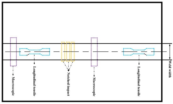 The welding joint specimens are subjected to water grinding first, followed by polishing with 3.5 µm diamond polishing paste. After polishing, the specimens are etched using a 5% nitric acid alcohol solution, followed by cleaning with alcohol, and then dried with hot air. The prepared metallographic samples are observed under an optical microscope (Leica MM6) for microstructural analysis. Further observation of the weld joint’s microstructure is conducted using a tungsten filament scanning electron microscope (SEM) model JSM-8680, produced by JEOL. Observation of microstructure of welded joints using JEM-2001F field emission lens electron microscope (TEM) produced by Nippon Electric Corporation. The hardness test is conducted using the Vickers hardness method, with a test load of 10 kg and a holding time of 15 s. According to the Rules for Materials and Welding by the China Classification Society (CCS), the mechanical properties of welded joints are primarily analyzed through longitudinal tensile, impact tests. The specimens for these tests are cut from butt-welded test pieces. The schematic diagram of mechanical properties specimens of butt joints in EGW is shown in Figure 3.
