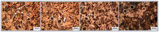 The microstructure of different seven-wire combination welds is shown in Figure 4a–d, as well as Figure 5a–d. The microstructure of the combination of seven-wire W1, W2, and W3 welds is mainly composed of coarse pre-eutectoid ferrite (PF) and AF. PF is characterized by elongated and polygonal shapes along the grain boundaries, while AF is mainly formed within the austenite grains and grows radially with inclusions as nucleation centers. The aspect ratio is generally in the range of 3:1 to 10:1. When the combination of seven-wire is twisted using five ordinary solid welding wires and two Ni-rich solid welding wires as symmetrical peripheral parting wires, as shown in Figure 4d, the microstructure of the W4 weld seam of the combination of seven-wire is mainly composed of PF. At this time, the PF becomes coarser and has a larger area.