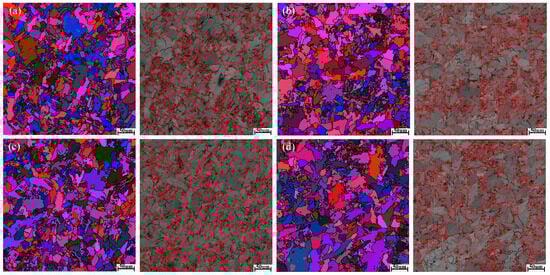 Figure 6a–d shows the EBSD Euler plots and grain boundary type distribution maps of the welded joints with four combinatorial seven-wire W1, W2, W3, and W4, respectively. Each color in the figure represents a grain orientation, and as shown in Figure 6, the microstructure of the four combinatorial seven-wire welds includes coarse PF and fine AF.