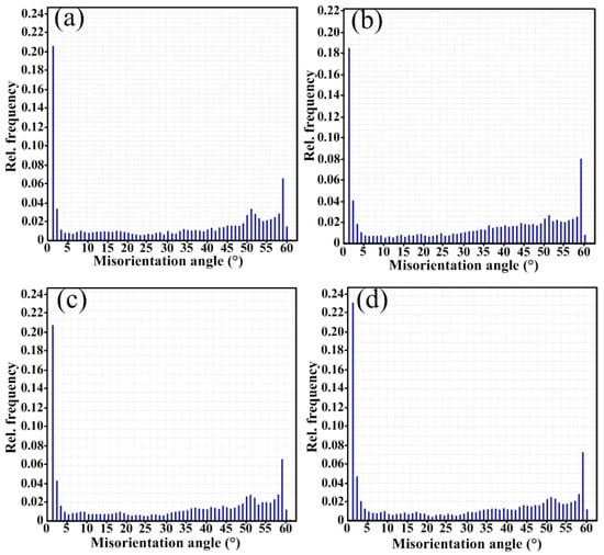 In Figure 6a–d, red represents large angle grain boundaries greater than 15°, and black represents small angle grain boundaries between 2° and 15°. The distribution of grain orientation differences in the four combinatorial seven-wire welds was statistically analyzed, and the results are shown in Figure 7. Due to the hindering effect of large angle grain boundaries (grain orientation difference ≥ 15°) on crack propagation, when cracks encounter large angle grain boundaries during the propagation process, the direction of the crack propagation path changes, making the propagation path tortuous and consuming more energy, which can improve the material’s ability to prevent brittle fracture. Therefore, increasing the proportion of large-angle grain boundaries can improve impact toughness. The proportion of large angle grain boundaries in the weld obtained by using the combinatorial seven-wire W1, W2, W3, and W4 is 65.9%, 68.8%, 66.0%, and 61.7%, respectively. It can be seen that the proportion of large-angle grain boundaries in the weld obtained by using the combinatorial seven-wire W2 is the highest, while the proportion of large-angle grain boundaries in the weld obtained by using the combinatorial seven-wire W4 is the lowest. That is, the larger proportion of large angle grain boundaries in the weld obtained by using the combinatorial seven-wire W2 is one of the reasons why its impact toughness is higher than that of the weld obtained by using the combination of ordinary welding wire W1.