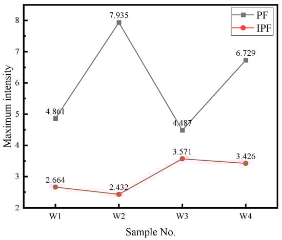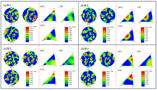 Figure 9a–d are the pole and reverse pole maps of the weld area under different combinatorial seven-wire, and the maximum electrode density of the corresponding four combinatorial seven-wire is shown in Figure 10. The maximum pole density is 7.935 in W2 and the reverse is 2.432.