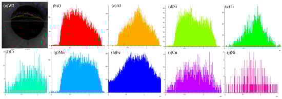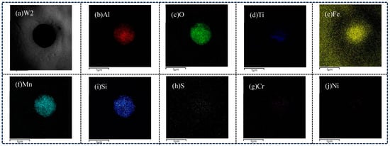 For W2, in order to further analyze the distribution of various elements on the inclusion, EDS line scanning and surface scanning methods were used to analyze the inclusion, and the results are shown in Figure 12 and Figure 13, respectively. As shown in Figure 12 and Figure 13, the main element at the center of the inclusion is Mn-Si-Al-Ti-O. Therefore, in addition to Mn-based oxides, Si-based oxides, and Al-based oxides, there are also Ti-based compounds (Ti-based oxides and TiN) at the center of the inclusion. Ti is more conducive to promoting the nucleation of AF compared to Mn, and Ti-based compounds can even precipitate on already-formed oxide inclusions and become nucleation particles of AF. Compared with inclusions composed only of oxides, it has a better effect on promoting the nucleation of AF; At the edge of the inclusion, the main element is Mn-Si-Cu-S, with very few Al and O elements. Therefore, at the edge of the inclusion, the main elements are Mn-based and Cu-based sulfides, as well as Si-based oxides, namely MnS, CuS, SiO2, and trace amounts of Al-based oxides.