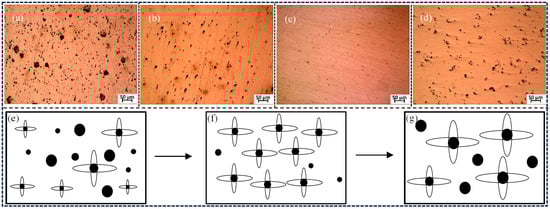 Figure 14a–d shows the distribution of inclusions in the weld seams of combinatorial seven-wire W1, W2, W3, and W4, respectively. It can be seen that the inclusions in the weld seams of the four combinatorial seven-wire are mainly spherical. The combinatorial seven-wire W1 weld has the most inclusions. On the one hand, there are many small diameter inclusions as nucleation sites, which are beneficial for the impact toughness of the weld. However, the presence of larger diameter inclusions in the weld reduces its toughness, resulting in lower impact toughness of the combinatorial seven-wire W1 weld. When using the combinatorial seven-wire W2, the number of inclusions in the weld seam decreases, the overall size of inclusions decreases, and there are no large diameter inclusions. Therefore, the presence of more small diameter inclusions that are beneficial for impact toughness increases the impact toughness of the weld seam. When using the combinatorial seven-wire W3, the number of inclusions in the weld seam is further reduced, but the overall size of inclusions is greatly reduced and the distribution is more uniform, thereby ensuring the improvement of the impact toughness of the weld seam. When using the combinatorial seven-wire W4, the number of inclusions decreases continuously while the overall size increases, resulting in the formation of more large-diameter inclusions, thereby reducing the impact toughness of the weld.