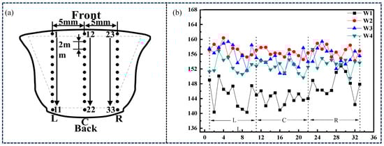 In order to analyze the distribution of overall hardness values of the welds, the centers of the front and back welds were taken as the centerline of the hardness test, with 5 mm on each side. Hardness spot tests were conducted along the plate thickness direction from the front weld to the back weld, with 11 test points in each column. Therefore, there are a total of 33 hardness test points in each weld. The distribution of Vickers hardness test points is shown in Figure 15a, and the test results are shown in Figure 15b.