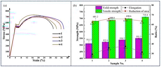 Longitudinal tensile tests were conducted on four combinatorial seven-wire welds. The stress-strain curves of the weld tensile specimens are shown in Figure 16a, and the corresponding tensile test results are shown in Figure 16b. With the increase of Ni content in the four combinatorial seven-wire welds, both the yield strength and tensile strength of the welds increase. The yield strength increases from 511.3 MPa in the combinatorial seven-wire W1 welds to 551.3 MPa in the combinatorial seven-wire W4 welds, with an increase of 7.8%. The tensile strength increased from 681.2 MPa for the combinatorial seven-wire W1 weld to 710.4 MPa for the combinatorial seven-wire W4 weld, with an increase of 4.3%. As the Ni content in the four combinatorial seven-wire welds increases, both the weld elongation and the weld section shrinkage first increase and then decrease. When the Ni content increases from 0.0288% to 0.0917%, the weld elongation increases from 29.3% to 37.5%, an increase of 27.9%, and the weld section shrinkage increases from 62.5% to 65.8%, an increase of 5.4%. As the Ni content increases to 0.1547%, the weld elongation decreases to 31.5% and the weld section shrinkage decreases to 63.5%.
