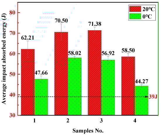 Six impact toughness specimens were taken from four sets of welded joints, and each group of three specimens was subjected to weld impact toughness tests at 20 °C and 0 °C. The results of four combinatorial seven-wire weld impact tests are shown in Figure 17. At 20 °C, the highest average impact energy of the weld seam is 70.50–71.38 J (W2, W3), which is 13.3% higher than the average impact energy of the weld seam of the seven wire W1 composed of ordinary welding wires (62.21 J). At 0 °C, the highest average impact energy of the weld seam decreased to 56.92–58.02 J (W3, W2), which was 19.4% higher than the average impact energy of the weld seam of the seven-wire W1 composed of ordinary parting wires (47.66 J). Through observation, it was found that as the experimental temperature decreases, the average impact energy of all four combinatorial seven-wire welds decreases accordingly. This is because as the temperature decreases, the welds gradually exhibit brittle characteristics, but the variation pattern of the average impact energy of the four combinatorial seven-wire welds is similar. It should be noted that the average impact energy of the welds using the combinatorial seven-wire W1, W2, W3, and W4 is higher than the 39 J required by the China Classification Society (CCS) standard at both temperatures. Among them, the average impact energy of the welds using the combinatorial seven-wire W2/W3 is higher than the average impact energy of the welds using the other combinatorial seven-wire at the same temperature. Further observation revealed that the average impact energy of the four combinatorial seven-wire welds under 20 °C and 0 °C conditions showed a pattern of W2/W3 > W1 > W4.
