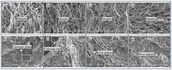 As the impact test temperature decreased to 0 °C, the impact fracture surfaces of these four combinatorial seven-wire welds clearly changed from ductile fracture to quasi-cleavage fracture, as shown in Figure 18e–h. The fracture surface presents a clear river-like pattern, and there are tearing edges around the quasi-cleavage plane, as well as a large number of ductile dimples. Due to the fact that the connection between quasi-cleavage planes is mainly achieved through shear or tearing with large plastic deformation, the formation process is similar to that of ductile dimples, forming local ductile dimples or tearing edges around them. Because quasi-cleavage fracture is caused by the propagation of many individual nucleated microcracks, which are connected to each other in a tearing manner and ultimately form a fracture, the quasi-cleavage facets are in a micro concave shape.
