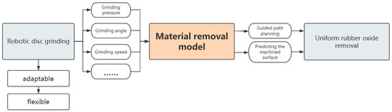 The rubber material has good thermal insulation, mechanical properties, and remarkable elasticity, enabling its application to objects of diverse shapes and sizes [1]. This material is characterized by ease of installation and use. In the aerospace industry, it is suitable to be utilized as an insulating layer within a solid rocket motor combustion chamber, protecting against high temperatures and pressures. However, it generates a smooth oxide layer on the surface after internal vulcanization, which needs to be ground to complete the surface roughening before use. Conventionally, the grinding of rubber materials has been performed manually, but this method has been shown to lack stability and result in inconsistent outcomes [2]. Robotic grinding is considered a good alternative for its flexibility and stability. To grind curved workpieces, a flexible disc grinder is usually installed at the end of the robot. Disc grinding is a widely used machining technique, particularly effective for processing materials with complex curved geometries [3,4]. The flexible layer of the grinding disc adapts to the shape of the material surface to achieve a large contact area and improve processing efficiency, and it mainly grinds the surface of the workpiece, allowing better control of the depth of material removal and the quality of the ground surface. Accurate material removal modeling enables reliable prediction of the surface of the processed material while helping to complete the grinding path planning, as shown in Figure 1. However, the coupled effects of grinding pressure, grinding speed, feed rate, material shape, and grinding path present significant challenges in modeling the material removal depth contour (MRDC) [5]. An efficient and reliable material removal model for rubber materials is needed to perform more accurate grinding of rubber materials.