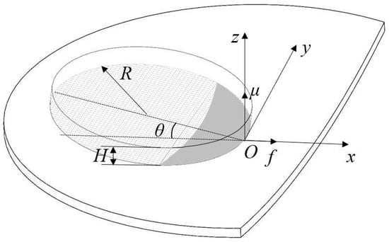 The radius of curvature of the grinding area of the rubber insulation layer is large. To explore the relationship between the grinding parameters and the contact force, the contact area between the flexible disc and the curved material to be ground is first modeled based on differential geometry theory, as illustrated in Figure 3. The spatial coordinate system is established as O-xyz; the grinding disc takes the contact point as the origin O, the feed direction is the same as the x-axis, the normal direction at the point O is the same as the z-axis, and the inclination angle between the grinding disc and the tangent plane of the material to be ground is θ; the thickness of the disc is H.