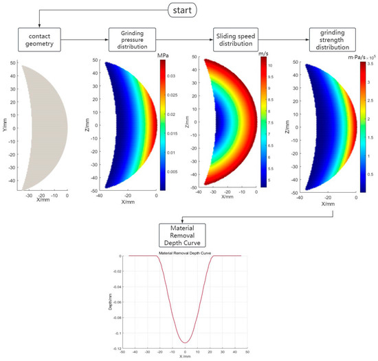 In the above equation, is the grinding strength at the corresponding point in the contact area of the grinding disc. Through this discretization method, the material removal depth at each point along the y-axis is determined, thereby establishing the cross-sectional profile of the grinding process.