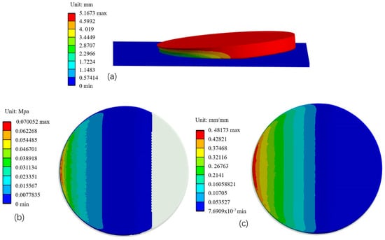 FEM method to test the interaction between the grinding disc and the workpiece. (a) Schematic of grinding disc deformation; (b) Contact Pressure Distribution; (c) Contact surface strain distribution.