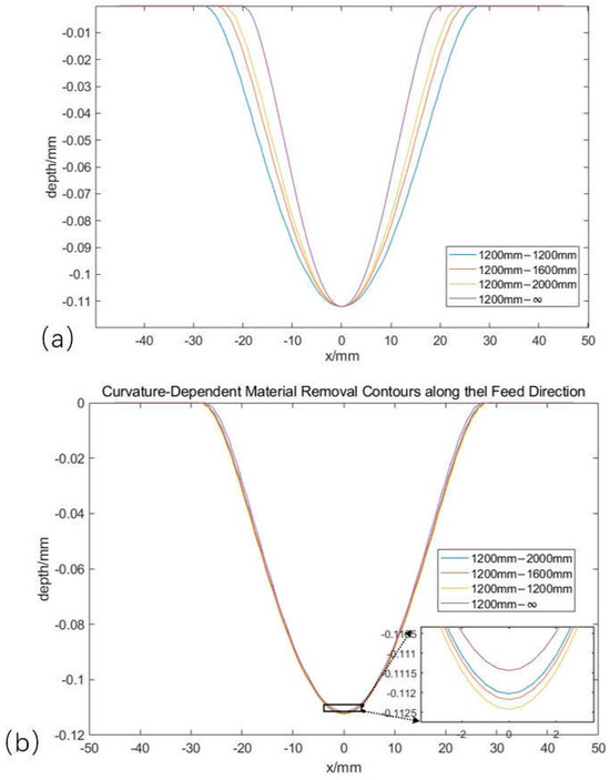 During the actual grinding process, the main grinding parameters to be varied are the grinding pressure, the grinding angle, and the radius of curvature of the grinding material. The modeling analysis is carried out along the grinding feed direction and perpendicular to the grinding feed direction. The calculated material removal contour is shown in Figure 14. Where (a) represents the variation of the radius of curvature in the vertical grinding feeding direction, as the radius of curvature increases to infinity, the amount of grinding downward pressure remains unchanged, the grinding pressure decreases, the grinding depth remains almost unchanged, and the grinding width decreases from 55 mm to 41 mm. Figure 14b shows the variation of the radius of curvature along the grinding feed direction. When the radius of curvature increases to infinity, there is no obvious change in the contact stress at the edge of the grinding contact area where the rotational speed is high, and the rest of the area is less affected, which ultimately leads to no obvious change in the width of the grinding contour and the grinding depth. Analyzing the grinding contour of the grinding disc on different shapes of surfaces can help to complete the path planning of surface grinding.