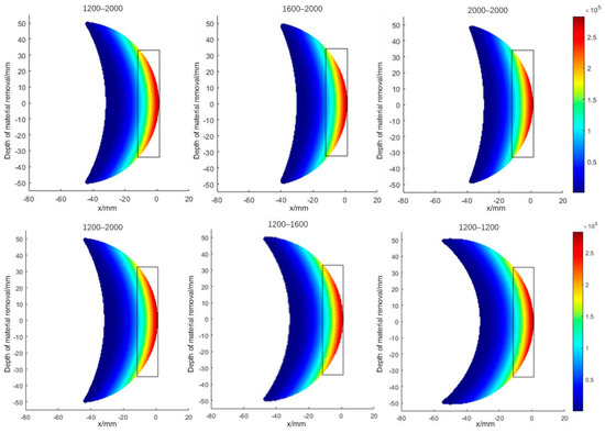 To find the reason behind the phenomenon, the distribution of contact removal at different curvatures of the workpiece is drawn, as shown in Figure 15. It can be observed that the size of the rectangular space on the graph is certain, and when the radius of curvature in the vertical grinding feed direction is changed, the curvature increases, and the area of larger grinding removal is concentrated at the tip of the grinding disc, so the grinding width decreases, but the maximum value of the grinding pressure does not increase, so there is no significant increase in the grinding depth. When the radius of curvature along the grinding feed direction is changed, the distribution area of material removal decreases with the increase in the radius of curvature, but there is no significant change in the area of the larger grinding pressure, no significant change in the maximum value of the grinding pressure, and no significant change in the final grinding depth and grinding width.