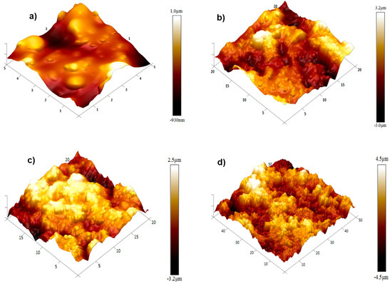 AFM measurements were performed using a Dimension ICON AFM microscope equipped with a NanoScope V controller (BRUKER Corporation, Santa Barbara, CA, USA) operating in the soft tapping mode in an air atmosphere with standard 125 μm single-crystal-doped silicon cantilevers with flexural stiffness of 42 N/m (Model PPP-NCH-10, NANOSENSORS, Neuchatel, Switzerland). The images were captured with a piezoelectric scanner featuring with a nominal dimensions of 85 × 85 μm. Micrographs were acquired using NanoScope Analysis 1.9 software (BRUKER Corporation, Santa Barbara, CA, USA).