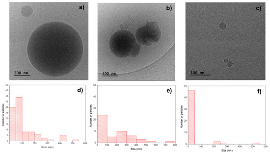 The cryo-TEM image of the PHBV/(R,S)-PHB specimen (Figure 5a) shows spherical particles with sizes: 15–550 nm. The average size (measured for 100 objects) is 110 nm and the size distribution measured for 100 particles is highlighted in the histogram in Figure 5d.