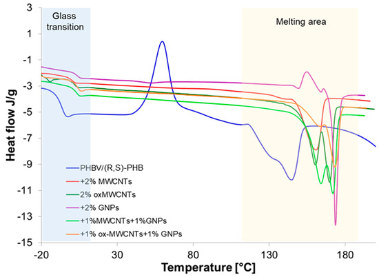 Glass transition and melting endotherms of PHBV/(R,S)-PHB composition and PHBV/(R,S)-PHB composites with MWCNTs, ox-MWCNTs and GNPs taken as third DSC runs.