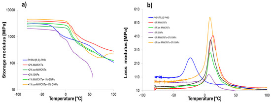The storage modulus (log scale) (a) and loss modulus (b) as functions of temperature for PHBV/(R,S)-PHB and composites.