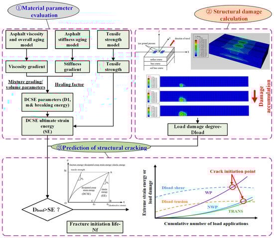 The rheological properties of the asphalt binder and the volumetric characteristics of the asphalt mixture were utilized to estimate the creep compliance parameters of the asphalt mixture. Crack analysis was conducted based on the different locations of the TDC manifestation. When the damage to the asphalt pavement caused by loading exceeds the yield strain energy of the asphalt mixture, crack initiation will commence on the pavement surface, and thus, it becomes possible to predict the TDC initiation life at different locations within the pavement structure. Among these crack types/classes, TDC is divided into longitudinal wheel path cracking (shear stress-related), longitudinal non-wheel path cracking (transverse tensile stress-related), and transverse cracking (longitudinal tensile stress-related) [30]. The research concept and study flow chart for the fracture energy-based top-down crack initiation model, as evaluated herein, is diagrammatically illustrated in Figure 1.