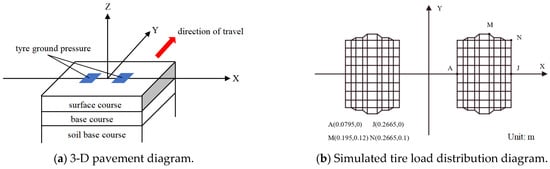 where, is the damage caused by the tensile stresses of each load cycle, is the tensile stress at the critical position, is the damage caused by the shear stresses of each load cycle, is the shear stress at the tire edge, = 0.35 is the Poisson ratio of the asphaltic material, and t is the loading time varying from 0 to 0.1 s. The parameter is the maximum creep strain rate of the asphalt mixture, whilst m and D1 are the creep compliance parameters. The total load damage caused by the tensile-shear stress is expressed by Equations (4) and (5) below [22]: