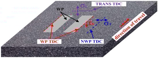 The pavement structure was modeled as a square-shaped slab with dimensions of 5 m × 5 m for both length and width, whilst the soil foundation beneath it had a thickness of 6m. To simulate the loading and stress distribution on an actual pavement structure, the measured tire-pavement contact pressure, including the vertical, lateral, and horizontal directional stress, was used. For the specific model configuration, boundary conditions, and interlayer contact conditions, references should be made to these authors’ previous publications, including those of Mao et al. [33] and Bai et al. [34,35]. Figure 3 illustrates the calculation and response locational positions for the longitudinal wheel path (WP), longitudinal non-wheel path (NWP), and transverse track zone (TRANS) in the driving direction.