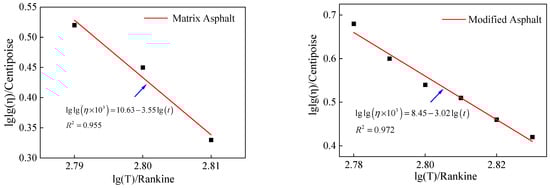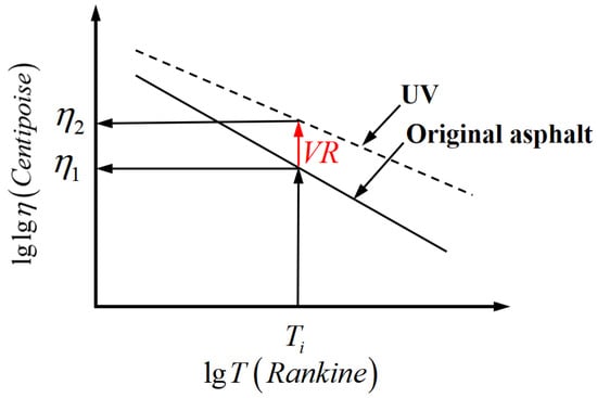 As illustrated in Figure 5, the logarithmic viscosity ratio under different aging conditions was used to calculate and quantitatively characterize the decay in the asphalt-binder viscosity at any given temperature using Equation (14) [26]: