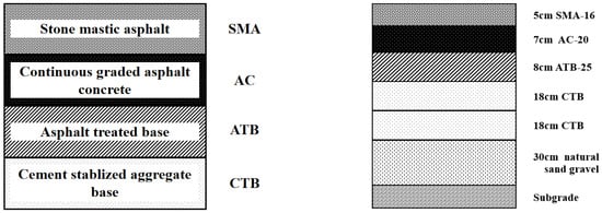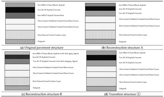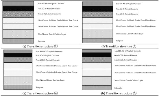 Field investigations by these authors found aggregate segregation with the AC-10/13 mixture comprising mostly of the fines, whilst the SMA-16 had more of the medium-sized grain aggregates. During core sampling, it was observed that the underlying ATB layer was loosely compacted and could not be fully extracted [53]. Therefore, the rehabilitation and reconstruction of the test section prioritized the replacement of SMA-16 with SMA-13, ATB-25 with AC-25 for the lower layer, and utilizing modified asphalt binder for the upper surfacing layer. Additionally, an anti-aging agent was added to the upper surfacing layer, whilst an anti-spalling agent was added to the lower layer. To offset the cost increment resulting from these material changes/replacements, an attempt was simultaneously made to reduce and optimize the thickness of the asphalt layers without compromising the pavement’s structural integrity and overall performance. Additionally, to investigate the effectiveness of the reconstructed pavement structure in resisting TDC further, five different pavement transitional structures were added to the study matrix for comparison purposes. The pavement structures that were modeled and numerically evaluated are presented in Table 2. The base asphalt binder used was 90# Karamay asphalt, the modified asphalt binder was SBS grades I-B, and all the SMA mixtures were modified with lignin fiber.