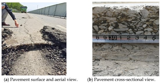 From the field surveys, the most observed cracking type was top-down cracking. Figure 8 exemplifies a typical pavement structure for the main local municipal road consisting of an asphalt macadam SMA-16 (surfacing layer), asphalt concrete AC-20, and asphalt stabilized macadam ATB-25 as the total 20 cm asphalt mixture thickness.