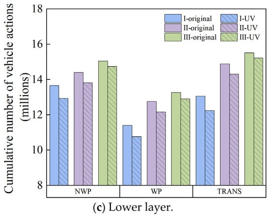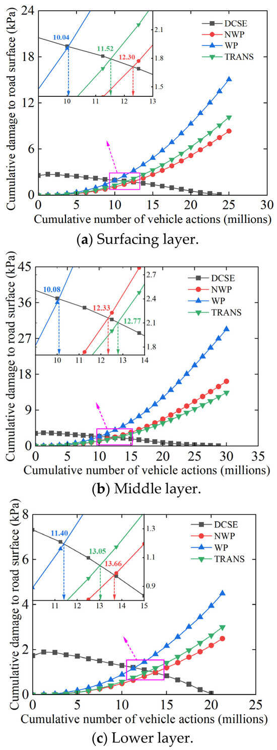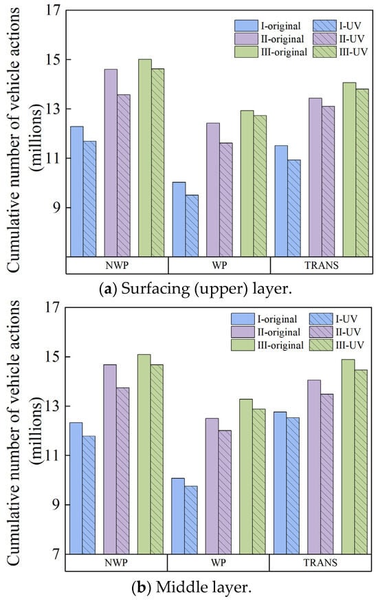 (4) After considering the effects of UV aging, the change pattern and response trends of the cumulative loaded-induced pavement damage were basically the same as those without UV aging consideration. In the different pavement structures evaluated, the TDC life in the different pavement layers exhibited a decreasing response trend with the influence of UV aging.