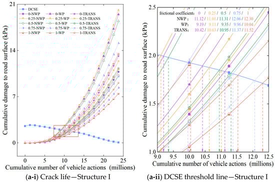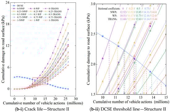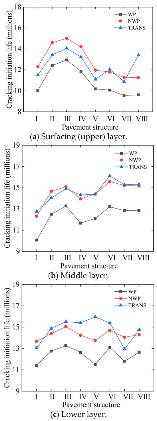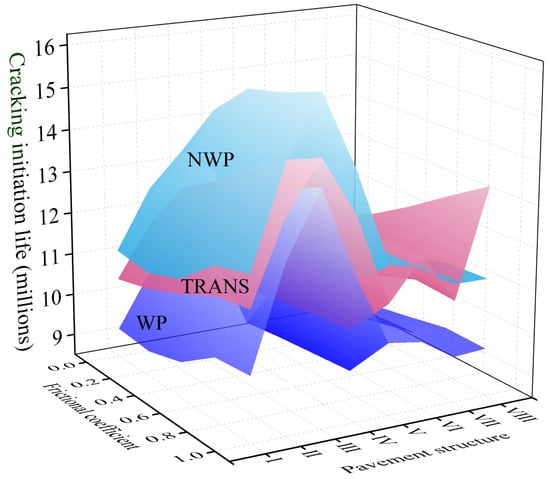 Computational results show that under different pavement structures, the crack initiation trend of the TDC in the surfacing (upper) layer is basically consistent with the results of the previous calculations. That is, under different interlayer states, the cracks are still being generated in the WP zone first, and the poorer the interlayer bonding condition, the smaller the crack initiation life is. With the gradual deterioration of the interlayer bonding state (i.e., the friction coefficient regressing towards zero), the degree of decay in the crack initiation life gradually increased and reached a peak reduction when full interlayer failure (i.e., complete debonding) occurred. This is partly due to the tensile stress distribution within the pavement structure being closer when the layers are partially and/or fully bonded. However, when the layers are fully debonded, the respective peaks of both the tensile and shear stresses within the pavement structure increase sharply at localized points—ultimately leading to rapid failure [21]. Therefore, based on the deduced mechanisms of TDC, the crack initiation life in the surfacing (upper) layer of the pavement structure correspondingly decreases when the interlayer bonding state between layers deteriorates.