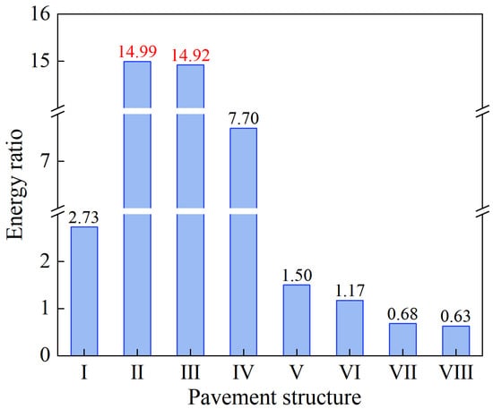 As can be seen from the figure, throughout the process of changing with aging time, the ER values of the reconstructed pavement Structures II and III are much larger than that of the original pavement Structure I and the transition pavement Structures IV, V, VI, VII, and VIII, respectively. Comparing pavement Structures II and III from the pre-aging phase through to about 50 months, the ER values of the two pavement structures are comparably overlapping and indifferent. However, with more aging time exceeding 50 months, pavement Structure III tends to exhibit better cracking-resistance performance than pavement Structure II. Furthermore, the ER values of the different pavement structures all show a tendency to increase at zero months and then decrease with aging time. From the previous numerical results in Section 4.2, it was seen that when AC-25 is used for the lower layer (namely pavement Structure I versus IV), the crack initiation life at the critical locations (i.e., 11.87, 14.21, and 13.24 million) is greater than that when ATB-25 is used (i.e., 10.04, 12.30, and 11.52 million), with the ER of pavement Structure IV (2.99) also being greater than that of pavement Structure I (2.55). When SAC-13 is used in the surfacing (upper) layer (namely pavement Structure I versus VI), the cracking life at critical locations (i.e., 10.07, 11.80, and 12.05 million) is comparable to that of SMA-16 (i.e., 10.04, 12.30, and 11.52 million), with the ER of pavement Structure I (2.99) also being greater than that of pavement Structure VI (2.55).