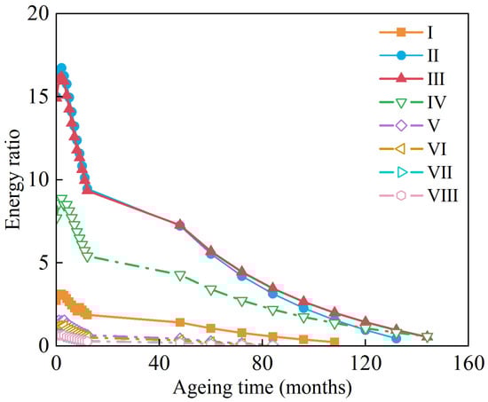 Considering the internal matrix structure and volumetric characteristics of the asphalt mixture itself (i.e., gradation, asphalt binder properties, aggregate properties, etc.) alone, an increase in the energy threshold () will inherently lead to an increase in the cracking resistance of the asphalt mixture. Compared to the reconstructed pavement Structures II and III, the energy threshold for the original pavement Structure I at 2.55 kPa was quantitatively the lowest. However, the energy thresholds of the reconstructed pavement Structures II and III are 27.06% and 47.06% higher than those of the original pavement Structure I, respectively. Theoretically, this suggests that the original pavement Structure I has the least ability to resist TDC among the three pavement structures and the top surfacing (upper) layer materials that were evaluated when subjected to similar environmental and loading conditions. The variation in the ER values of the asphalt mixtures at different aging times is illustrated in Figure 18.