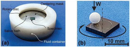Wear test setup: (a) the assembled rotating support with the specimen immersed in AS, and (b) the specimen under the alumina ball showing a track after wear test.