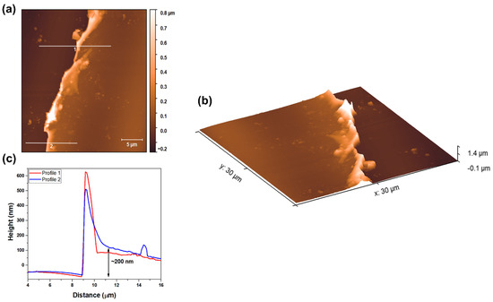 Figure 4 illustrates the results obtained from AFM in contact mode for Nb2O5 coatings deposited on commercial and polished glass substrates using the reactive sputtering technique. Figure 4a depicts the results obtained after removing the Kapton tape, which was employed to ascertain the thickness of the Nb2O5 coating at various points on the surface. It is apparent that some debris remains on the film surface due to the tape removal, despite subsequent cleaning with isopropanol, water, and a nitrogen jet. Two profiles were used to delineate the interface between the substrate and the Nb2O5 thin film, enabling an estimation of the film thickness, which was determined to be approximately 200 nm, as reflected in the graph presented in Figure 4c. The substrate–film interface is illustrated in three-dimensional topography in Figure 4b to elucidate the distinctions between the two layers. Using AFM images and Gwyddion software, the mean roughness (Sa) of the Nb2O5 coating and the glass substrate was estimated at 15.3 nm and 10.0 nm, respectively. As the deposition process was conducted via reactive sputtering, an increase in film roughness relative to the glass substrate was observed, attributed to the nucleation process occurring in the initial stages of film formation.