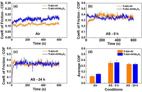 Coefficient of friction (COF) as a function of the environmental conditions for the Ti-6Al-4V and Ti-6Al-4V/Nb2O5 (a) in air after immersion on AS for (b) 0 h and (c) 24 h, and (d) average COF for all the tested samples as a function of the environmental conditions.