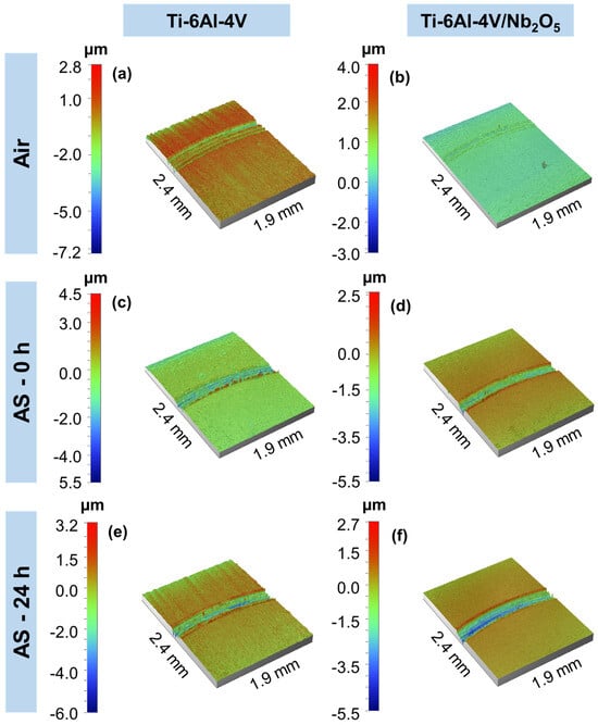 To improve the assessment of the wear performance of both coated and uncoated specimens, the profiles of the wear tracks were analyzed using profilometry (refer to Figure 6). Under all testing conditions, the Ti-6Al-4V and Ti-6Al-4V/Nb2O5 samples exhibited an abrasive wear mechanism, which was characterized by parallel grooves aligned with the direction of wear. In samples tested in air, Figure 6a,b, the wear track for the Ti-6Al-4V/Nb2O5 sample is nearly imperceptible compared to the uncoated Ti-6Al-4V. For the samples tested immediately after AS immersion, Figure 6c,d both showed noticeable material displacement at the wear track border, with the base substrate presenting higher peak heights and a larger track diameter compared to the coated sample. Finally, Figure 6e,f illustrate the wear track profile for the Ti-6Al-4V and Ti-6Al-4V/Nb2O5 samples after 24 h of immersion on AS, where the coated sample exhibited a significantly reduced wear track diameter in comparison to the uncoated Ti-6Al-4V, suggesting the coating’s efficacy in protecting the metallic matrix against wear. In addition to the wear track profile obtained with the profilometry analysis, Figure 7 displays the average roughness (Ra) and distance from peak-to-valley (Rt) obtained for the uncoated and coated Ti-6Al-4V samples considering all the tested conditions. As expected, similar values of Ra and Rt were observed among both Ti-6Al-4V (84.96 ± 0.08 nm and 1.19 ± 0.04 µm, respectively) and Ti-6Al-4V/Nb2O5 (84.34 ± 0.56 nm and 1.58 ± 0.07 µm, respectively) considering the air environment, since the Nb2O5 thin film does not promote a significant modification on substrate topography due to its relatively low thickness, around 200 nm [3,5]. Regarding the samples after the Pin-on-Disk analysis under 0 h immersion in AS, since the exposure time in this aggressive environment is low, no significant modification in the Ra and Rt values is perceived, compared to air, for Ti-6Al-4V/Nb2O5 (85.07 ± 0.49 nm and 1.37 ± 0.12 µm) and a slight increase, around 10%, for the Ti-6Al-4V (92.93 ± 0.52 nm and 2.14 ± 0.12 µm, respectively) associated with the onset of corrosion processes in the metallic matrix. Finally, considering the samples after 24 h immersion in AS, the coated sample exhibited a 10% increment in the Ra and Rt values (94.39 ± 1.92 nm and 1.47 ± 0.09 µm, respectively), similar to the base material for 0 h immersion in AS. However, for the uncoated Ti-6Al-4V, after the 24 h immersion in AS, the values of Ra and Rt were, respectively, 224.23 ± 8.35 nm and 2.89 ± 0.06 µm, representing an increment of approximately 190% in comparison to the sample in air. This increase in the average roughness and peak–valley distance can be associated with the attack promoted by the aggressive medium on the metal matrix, which leads to the formation of corrosion products that, despite sealing the defects present on the TiO2 thin film, promote an intense modification on the substrate topography.