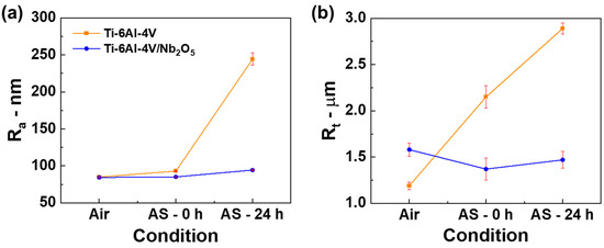 (a) Ra and (b) Rt values as a function of the environmental exposure condition considering the Ti-6Al-4V and Ti-6Al-4V/Nb2O5 samples.