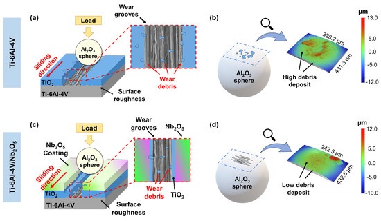 To gain a deeper insight into the interaction between the spheres and the coated and uncoated Ti-6Al-4V samples, supplementary profilometry analyses of the Al2O3 sphere counterparts were performed. Figure 8 presents a schematic representation of the wear mechanism for Ti-6Al-4V and Ti-6Al-4V/Nb2O5 specimens in the air environment, along with profile images of the interaction region on the Al2O3 spheres’ surfaces after the Pin-on-Disk test. When comparing both samples tested in air, a difference in the wear track diameter is observed, attributed to the modification of the surface hardening promoted by the Nb2O5 coating and the respective wear mechanisms in each case (Figure 8a,c). Comparing the spheres, the one in contact with the uncoated sample displayed more debris and grooves on its surface (Figure 8b), indicating a more intense interfacial interaction and material removal from the sample compared to Ti-6Al-4V/Nb2O5 (Figure 8d). Additionally, it is worth mentioning that the spheres used in the Pin-on-Disk analysis presented average Ra and Rt values of 37.91 ± 8.45 nm and 1.54 ± 0.26 µm, respectively.