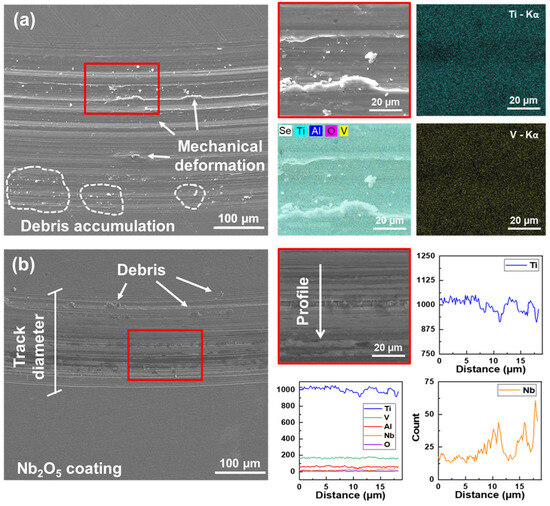 SEM/EDX wear track analysis for both (a) Ti-6Al-4V and (b) Ti-6Al-4V/Nb2O5 tested in air.