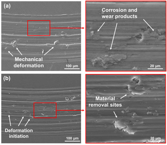SEM/EDX wear track analysis for both (a) Ti-6Al-4V and (b) Ti-6Al-4V/Nb2O5 after 24 h of immersion in AS solution.