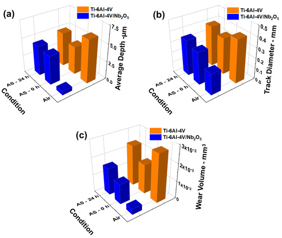 Complementary data from the wear track profile from the Ti-6Al-4V and Ti-6Al-4V/Nb2O5 samples obtained from the profilometry analysis, (a) average track depth, (b) wear track diameter, and (c) wear volume.