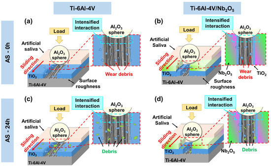 Schematic representation of the wear mechanism associated with the (a,c) Ti-6Al-4V and (b,d) Ti-6Al-4V/Nb2O5 samples considering the different times of immersion on AS.