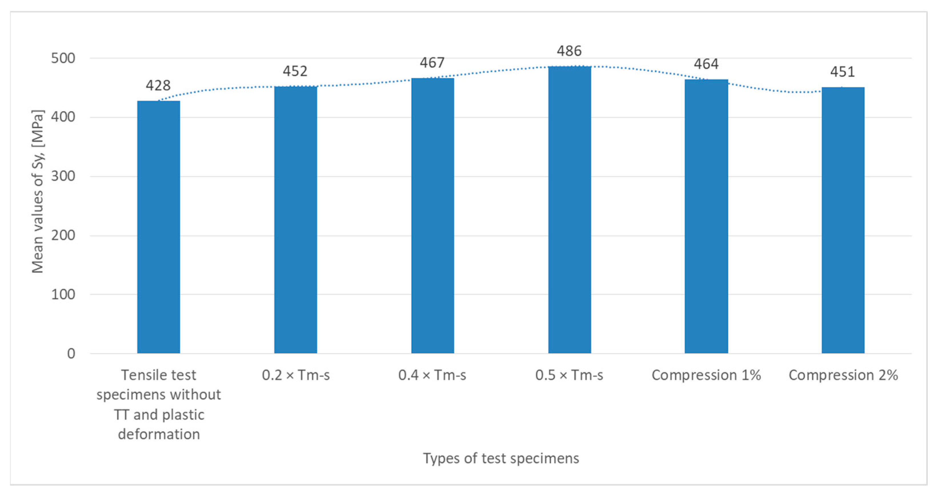 The highest value recorded for Sy reaches a peak of 486 MPa for specimens subjected to 0.5 × Tm−s, suggesting a significant strengthening of the material due to structural deformation or rearranging the internal crystalline structure.