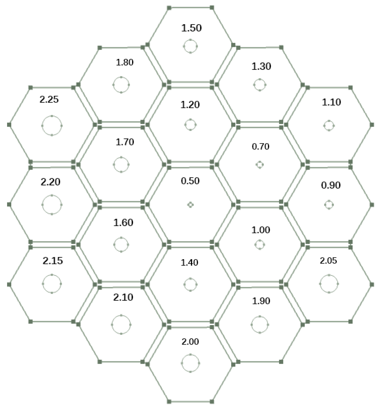Based on the theoretical and simulation results given in the previous section, it was found that parallel multiple Helmholtz resonators could achieve broadband sound absorption within the structure. Therefore, a HHSAM structure consisting of 19 Helmholtz resonators was designed. The HHSAM structure was constructed using parallel Helmholtz structures with different resonance frequencies, and we arranged them according to a certain periodic rule. The bottom and core layers of the HHSAM structure were created using 3D printing technology. The top panel was created by machining small holes of different diameters on a 1-mm-thick aluminum panel. Then, the two were combined through latex stations to form a HHSAM structure. The sample of the HHSAM structure is shown in Figure 6. The diameter of the sample is 100 mm. The height of the sample is 50 mm. The side length of a hexagonal honeycomb is 10 mm. The wall thickness of the honeycomb core is 2 mm. There is a hole on the top panel corresponding to each honeycomb, which represents the neck of the Helmholtz resonator. The size and distribution of the neck are shown in Figure 7 (unit in mm). A two-microphone impedance tube (type 4206) from Bruel Kjaer is applied to measure the normal incident absorption coefficient according to the standard procedure detailed in ISO (10534-2). The frequency range of measurement is from 100 to 1600 Hz. Figure 8 shows the test system of the impedance tube. Figure 9 shows the sound absorption performance of the HHSAM structure obtained through theoretical and numerical simulations and impedance tube experiments. It can be seen that the scope of action of the theoretical calculations and numerical simulations is basically consistent. The experimental results deviate slightly from the theoretical and numerical simulation results, which may be caused by manufacturing errors in the samples. Figure 10 shows the sound pressure distribution of the HHSAM structure at the peak absorption frequency. It can be seen from the distribution of the sound pressure that different Helmholtz resonator cells play different roles at different frequencies. Moreover, each Helmholtz resonance cell has a more or less mutual influence on other nearby cells. In summary, the theoretical, numerical, and experimental results effectively demonstrate that the HHSAM structure has good sound absorption performance over a wide frequency band range.